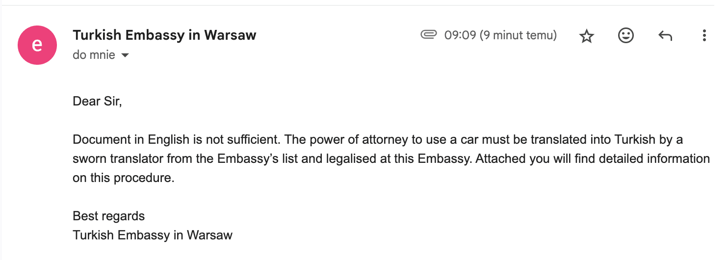 A co zrobisz Ty? No cóż – Twój wybór. Twoja przygoda, Twoje ryzyko. Ja tylko dzielę się tym, co u mnie zadziałało i co dało mi 100% pewności na granicy. Jeśli chcesz mieć większy spokój i pewność, że nie utkniesz z powodu jakiegoś papierka, to dokumenty z listy, którą wcześniej opisałem, dają Ci znacznie większą gwarancję wjazdu i po prostu mniej stresu. A przecież nie po to jedziesz do Turcji, żeby negocjować z celnikiem przy szlabanie. Na koniec poniżej załączam maila, którego dostałem z Ambasady Turcji w Warszawie. Zapytałem ich wprost, czy wystarczy zwykłe poświadczenie od leasingodawcy po angielsku, żeby wjechać do Turcji. Odpowiedź była konkretna: